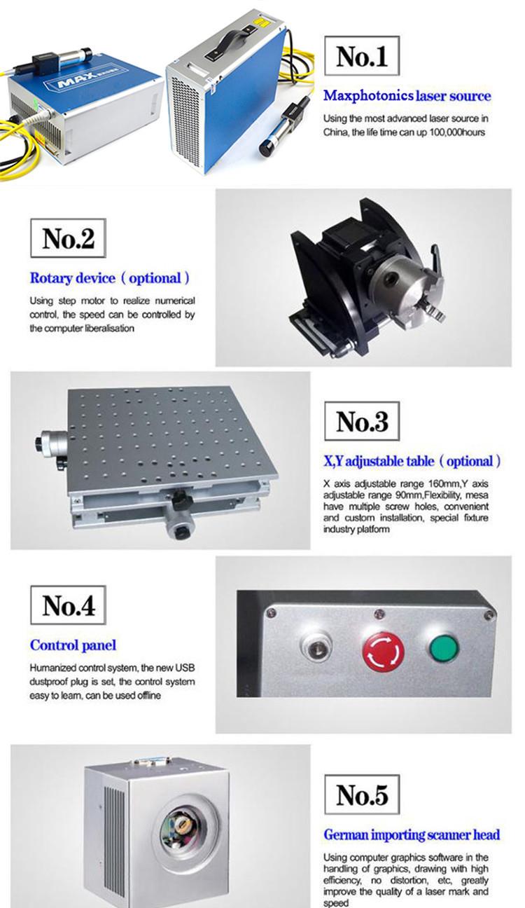 Fiber laser marking machine designed to easy-move equipment, air-cooling, compact machine, Perfect output beam quality, high reliability, no consumables, maintenance-free. Long life Working. Import Germany IPG fiber laser, the international latest, most reliable structure, small size, power consumption is small, no high-voltage without large water-cooled system. Close to the ideal beam, USB interface, output control, optical scanning system, laser repetition rate high, high-speed without distortion.